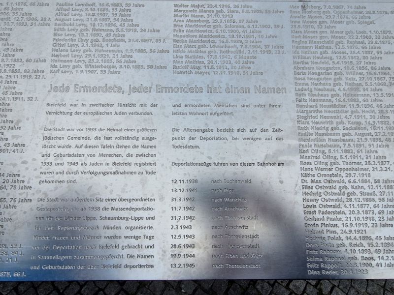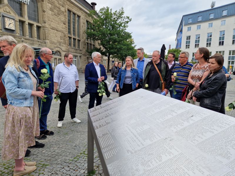 Zum Abschluss des Treffens ging die gesamte Gruppe noch zum Gedenkort der Deportationen vor dem Bielefelder Hauptbahnhof und legte dort, nach einer kurzen Erläuterung des Stadtarchiv-Direktors Dr. Jochen Rath, weiße Rosen im Gedenken an die Deportierten nieder (siehe Fotos). Für alle Teilnehmenden war das nochmals ein bewegender Augenblick. Einige Teilnehmende hatten den Ort erstmals ganz bewusst wahrgenommen. Zum Teil kannte man den Ort noch gar nicht.